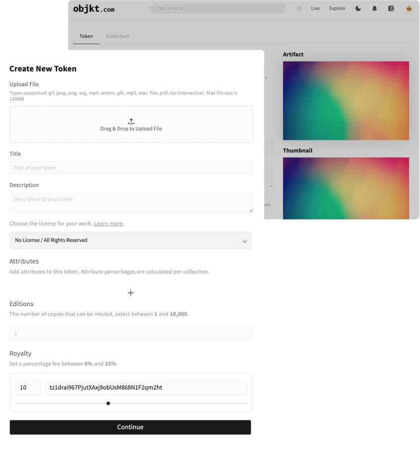 In the legacy art world, until a book is published or a canvas is signed, it’s not really complete. After double checking the details of the file you’ve uploaded, your title, description, licensing & royalties you’d like to receive... you can sign your work by clicking ‘mint’! This action submits a signal to the blockchain to mint your digital work and to list it on the Objkt.com marketplace. It can take a few minutes, but your creator journey starts when you click ‘mint’.