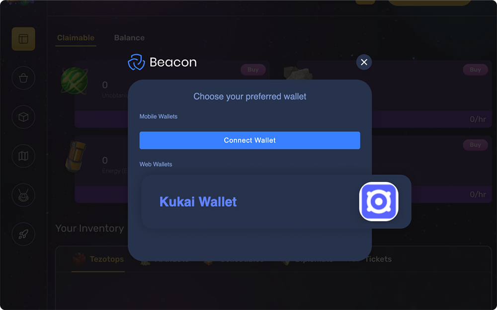 A pop up with several wallet options opens up. For the purposes of this tutorial, click Kukai Wallet to proceed to the Kukai website.