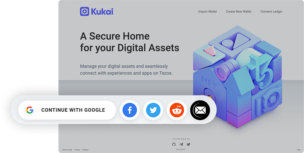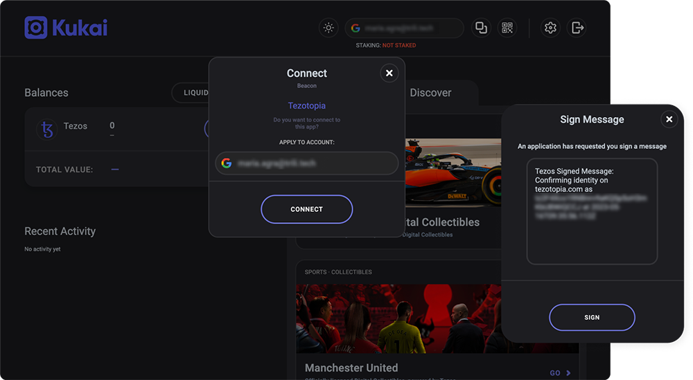 On the Kukai website, click sign in with Google and enter your Google email and password. Once logged in, you will be brought to a wallet overview page that shows your crypto balances, NFTs/collectibles, and recent activity.